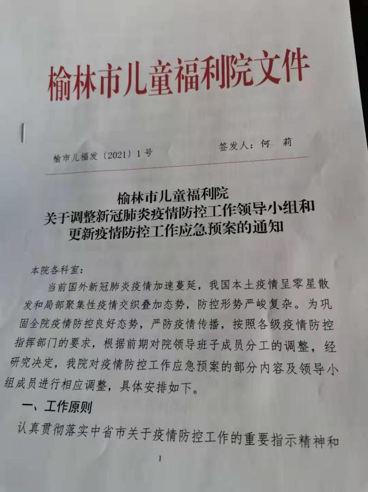 1月7日印发《榆林市儿童福利院关于调整新冠肺炎疫情防控工作领导小组和更新疫情防控工作应急预案的通知》,在前期对院领导班子成员分工调整的基础上,结合实际情况,对疫情防控工作应急预案的部分内容及领导小组成员进行更新调整。