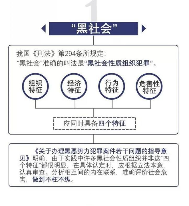 我国《刑法》第294条规定,“黑社会”准确的叫法是“黑社会性质组织犯罪”。刑法规定,“黑社会性质组织犯罪”应同时具备“组织特征”、“经济特征”、“行为特征”和“危害性特征”(简称为“四个特征”)。《关于办理黑恶势力犯罪案件若干问题的指导意见》明确,由于实践中许多黑社会性质组织并非这“四个特征”都很明显,在具体认定时,应根据立法本意,认真审查、分析相互间的内在联系,准确评价社会危害,做到不枉不纵。