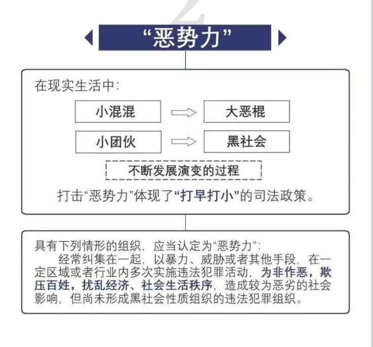 关键词二:“恶势力” 在现实生活中,从“小混混”到“大恶棍”,从“小团伙”到“黑社会”,存在一个不断发展演变的过程。打击“恶势力”体现了“打早打小”的司法政策。具有下列情形的组织,应当认定为“恶势力”:经常纠集在一起,以暴力、威胁或者其他手段,在一定区域或者行业内多次实施违法犯罪活动,为非作恶,欺压百姓,扰乱经济、社会生活秩序,造成较为恶劣的社会影响,但尚未形成黑社会性质组织的违法犯罪组织。
