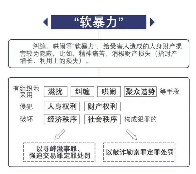 近年来,纠缠、哄闹等“软暴力”,给受害人造成的人身财产损害较为隐蔽,比如,精神痛苦,消极财产损失(指财产增长、利用上的损失)。黑恶势力为谋取不法利益或形成非法影响,有组织地采用滋扰、纠缠、哄闹、聚众造势等手段侵犯人身权利、财产权利,破坏经济秩序、社会秩序,构成犯罪的,应当分别依照《刑法》相关规定处理。以寻衅滋事罪、强迫交易罪定罪处罚,或以敲诈勒索罪定罪处罚。