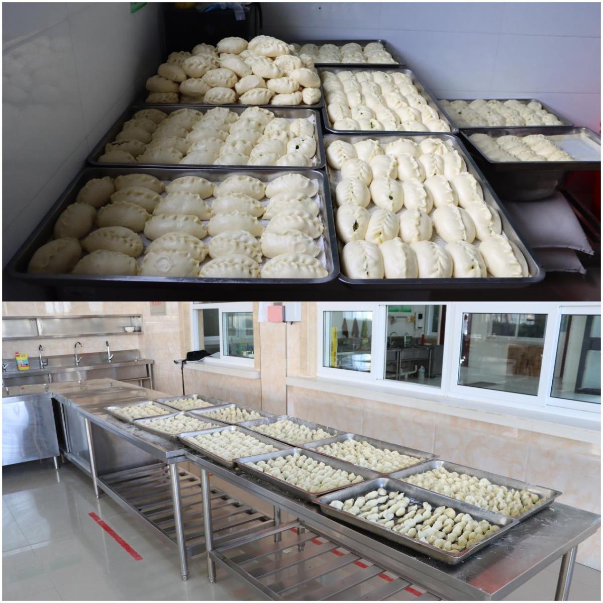 上午九时许,餐厅已是一片忙碌而温馨的景象。长长的案板上,面粉、饺子皮、各种馅料整齐摆放。大家分工有序、默契配合——揉面、调馅、擀皮、包捏,每一道工序都细致入微,蕴藏着对孩子们深深的祝福。欢声笑语间,暖流悄然流淌在每个人心中。