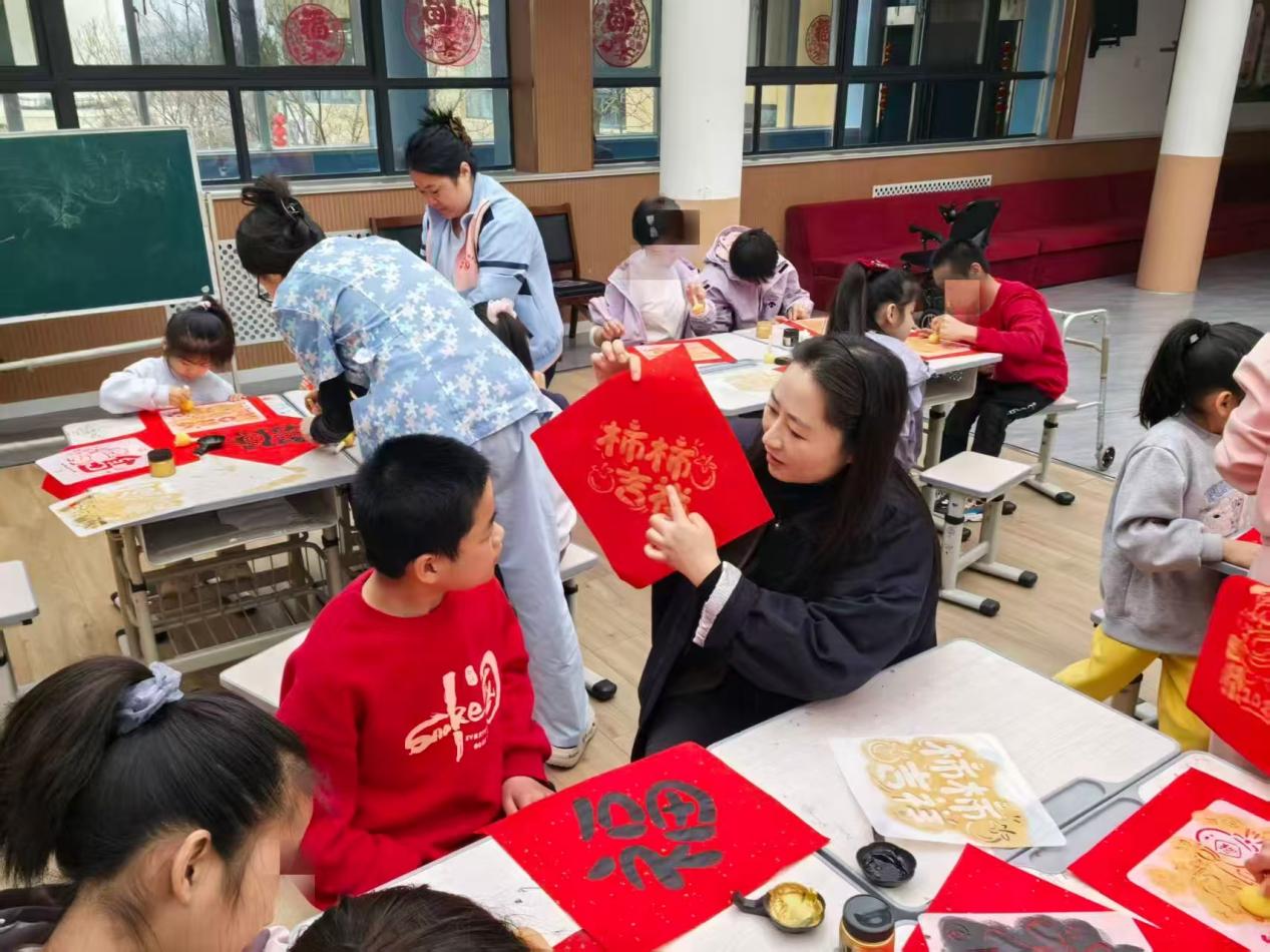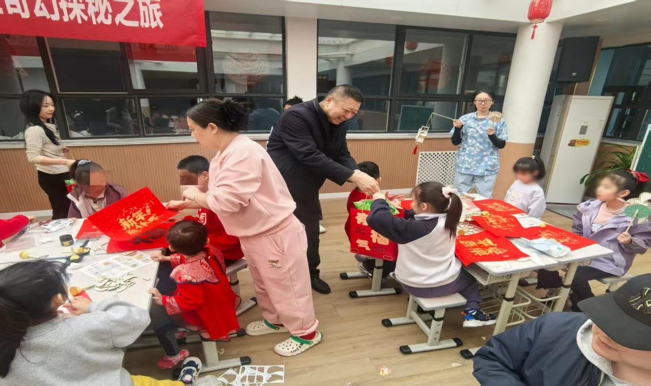 雷院长、崔院长与白主席,“手工创作”阶段深入各小组,与孩子们并肩围坐。院领导们放下繁忙政务,在不影响日常工作的前提下,化身“大队友”,手把手指导孩子贴珍珠、组灯笼。这种跨越年龄的共同创作,让现场充满了家一般的温馨,也让孩子们在专注指尖技艺的同时,深切感受到了长辈的关爱。