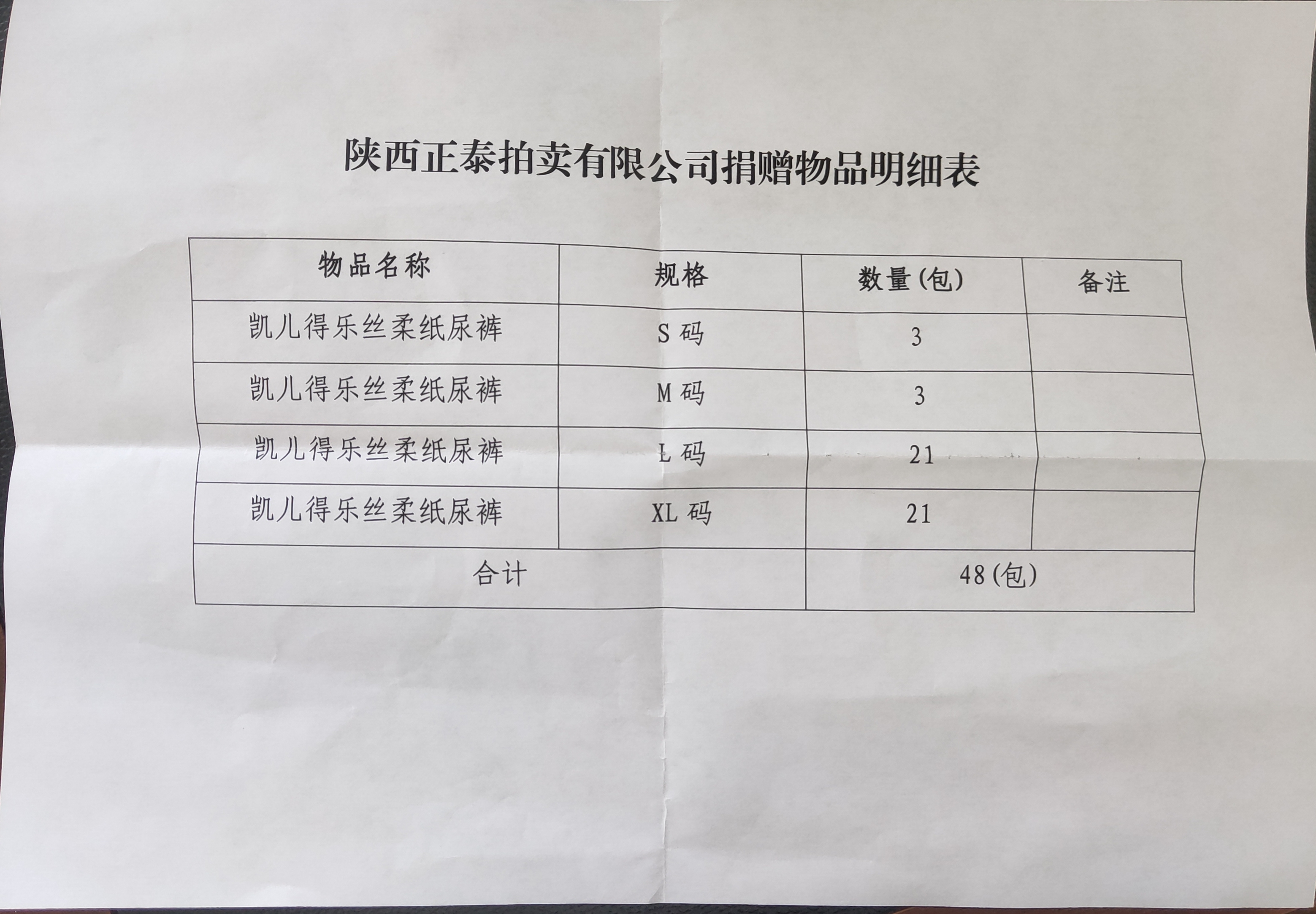 2021年3月5日,陕西正泰拍卖有限公司一行2人来我院捐赠,为我院儿童带来纸尿裤48包,感谢陕西正泰拍卖有限公司的爱心捐赠!