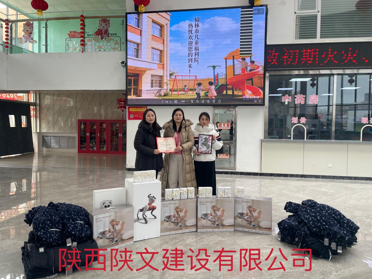 2.陕西陕文建设有限公司捐赠棉裤300条,棉马甲100件,电动摇椅4套,机器狗1台,小型音响12个。
