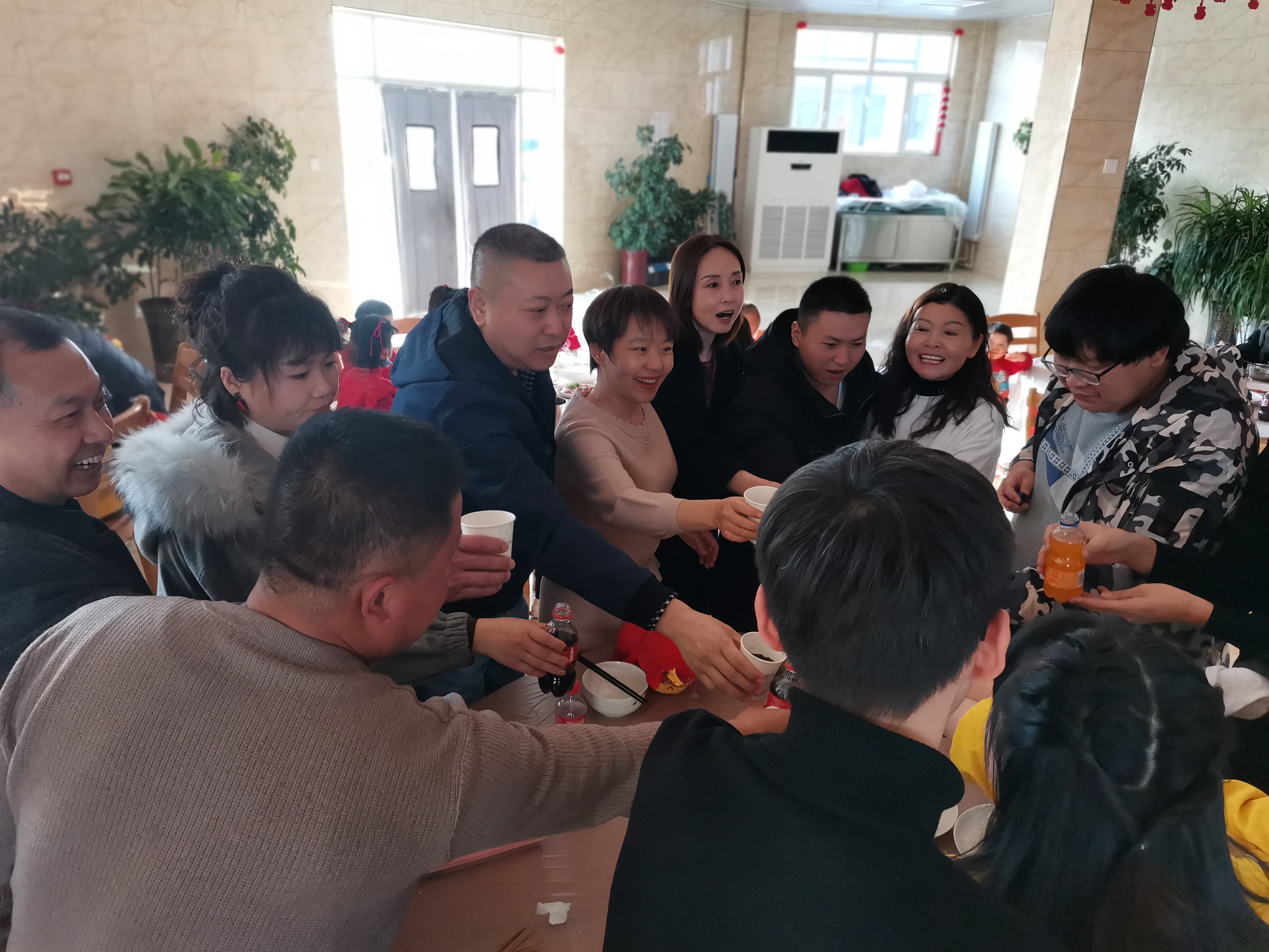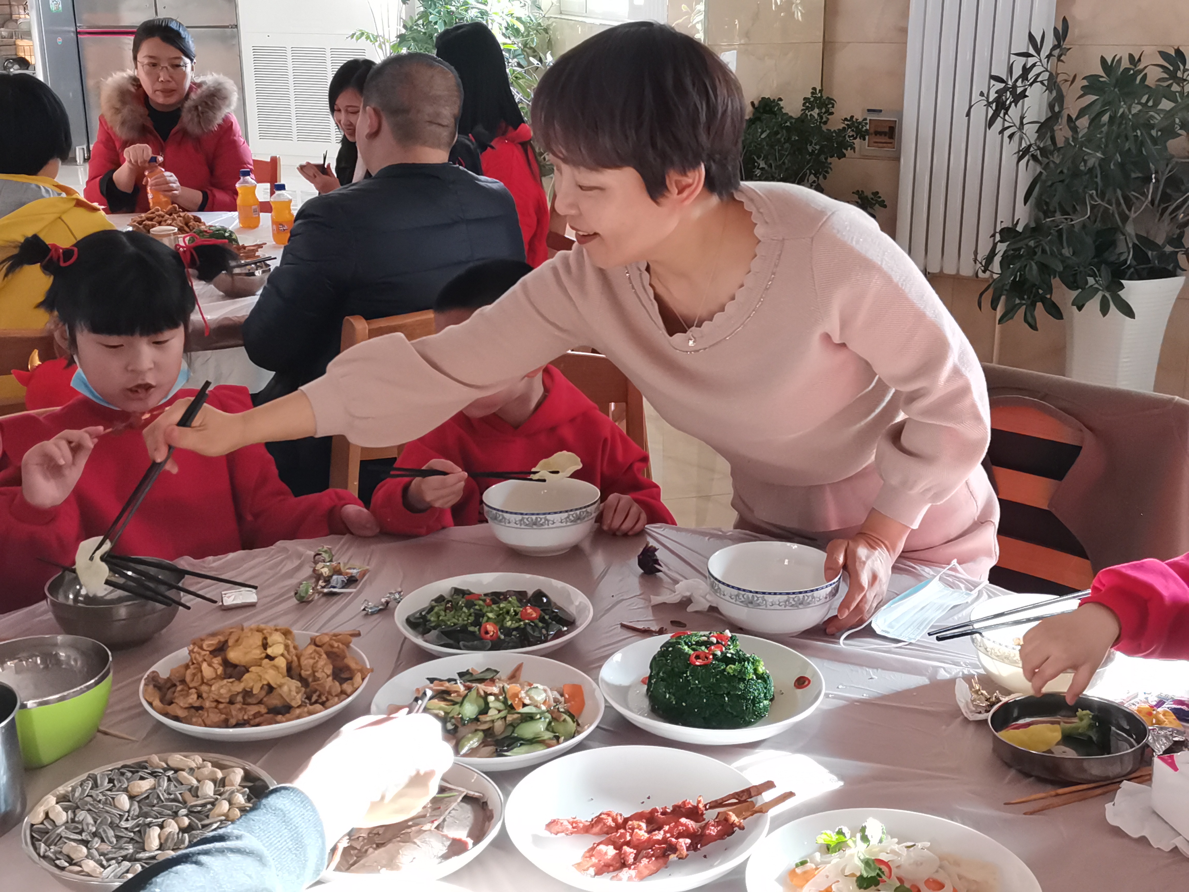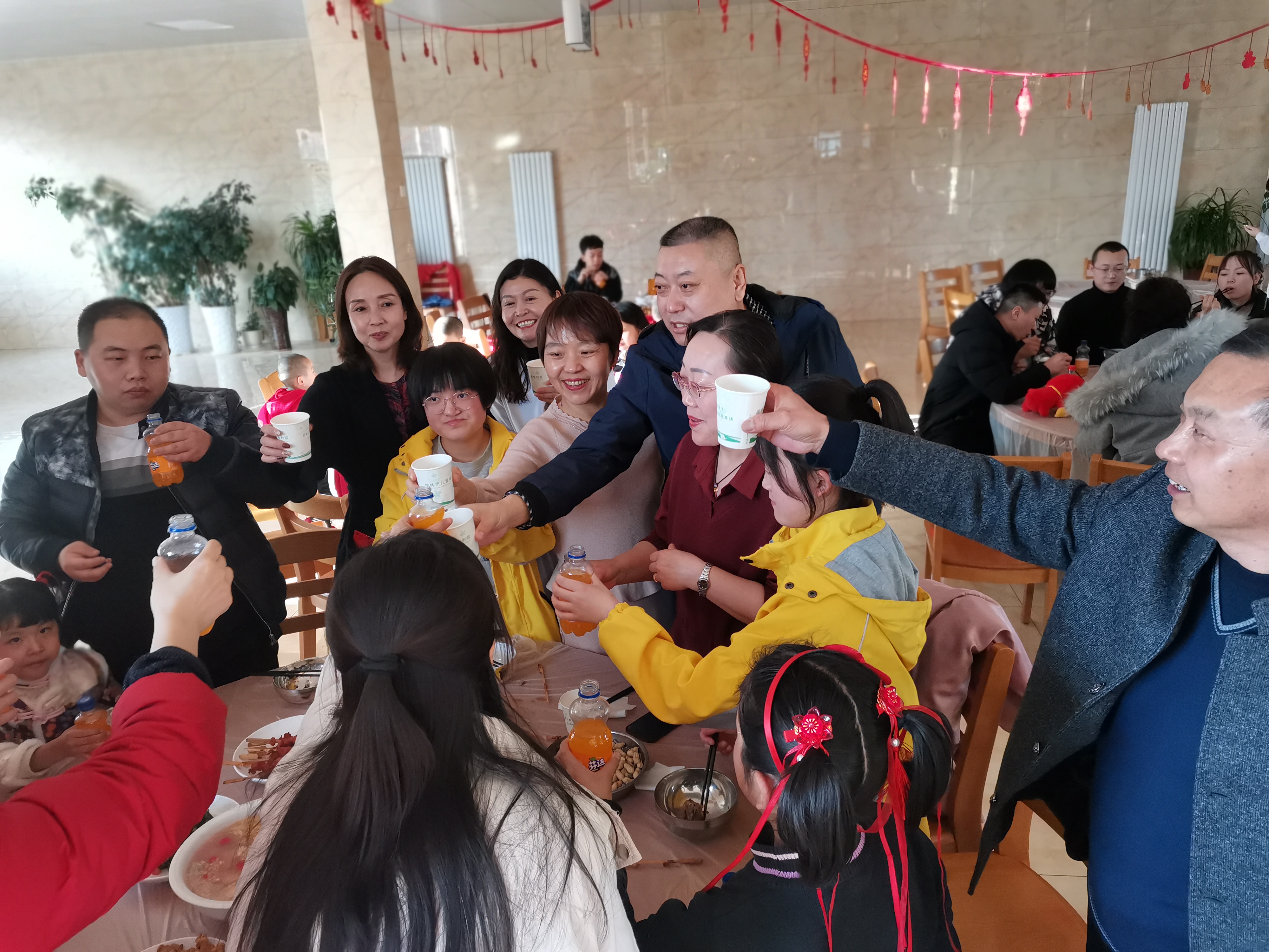 欢乐的音乐响起,院领导班子成员、各科室负责人在餐厅与孩子们围坐在一起,品尝着年夜饭的美味佳肴,共同庆祝新春佳节,孩子们的脸上洋溢着幸福欢乐的笑容。