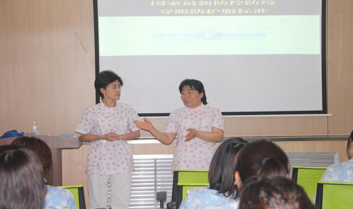 此次培训首先由护理部主任李爱芬详细讲解了穿脱防护服和隔离衣,七步洗手法的注意事项,同时强调了医疗废弃物处置的重要性。然后由护士长景朵朵现场示范“穿、脱防护服”全部操作流程,并将手部卫生、正确佩戴N95口罩, 穿脱防护服的要点、难点和细节再次进行详细说明。随后各科室工作人员进行现场穿脱演练,李主任对穿脱不规范之处给予指导,确保人人掌握,达到预期效果。