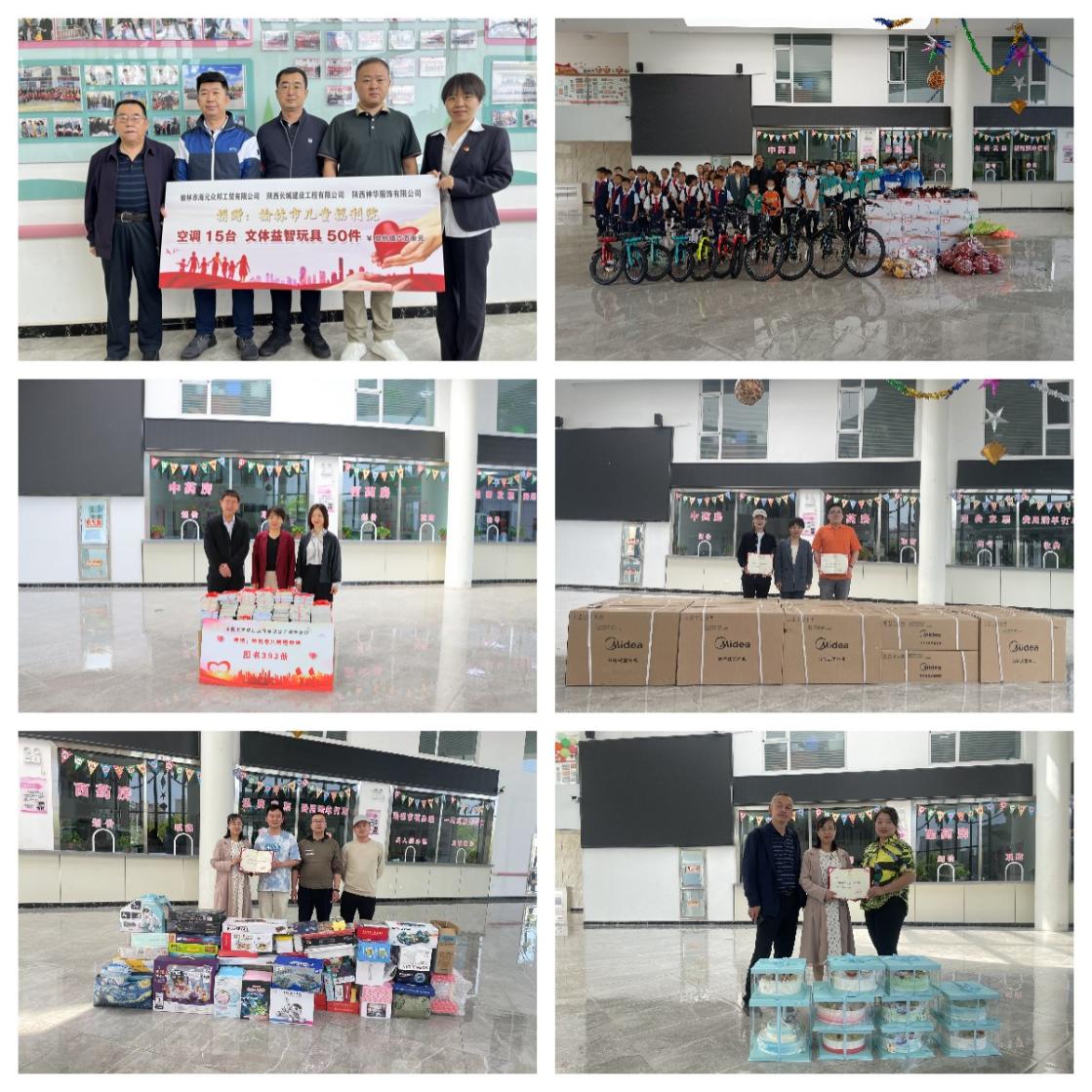 最美人间六月天,童心灿烂,爱心满满。在六一儿童节到来之季,社会各界爱心企业和个人走进儿童福利院,用不同的方式表达着对院内儿童的牵挂与关爱,献上了自己的一片爱心。其中榆林市海元众邦工贸有限公司陕西长城建设工程有限公司、陕西神华服饰有限公司为我院捐赠空调十五台、益智玩具50余件,价值六万余元;爱心人士秦丹、谢宝龙捐赠空调十个,价值四万余元 ;未成年保护咨询委员会向我院捐赠自行车、滑板车等体育器材;价值一万余元,中国工商银行股份有限公司榆林分行捐赠图书393册,价值一万余元;厦门香溢已坚持七年,每年捐赠蛋糕十余个。捐赠的物品是有价值的,但是社会各界对儿童的牵挂是无价的,我们感谢社会各界爱心人士对我院儿童的牵挂与奉献,感谢社会各界对我院工作的支持,对我院儿童无私的关爱。送人玫瑰,手留余香,祝福好心人一生平安。