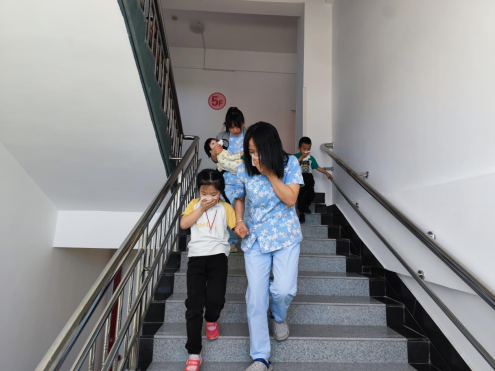 随着火警铃声响起,各岗位有序的进行撤离。儿童在保育员和康复师的陪护下安全、快速进行撤离。