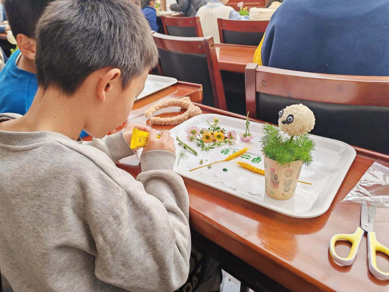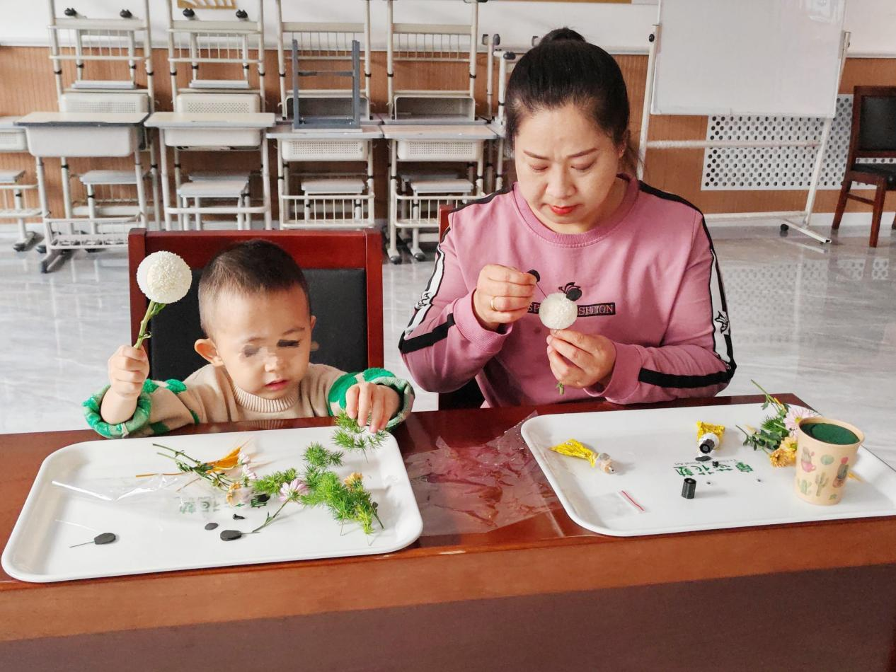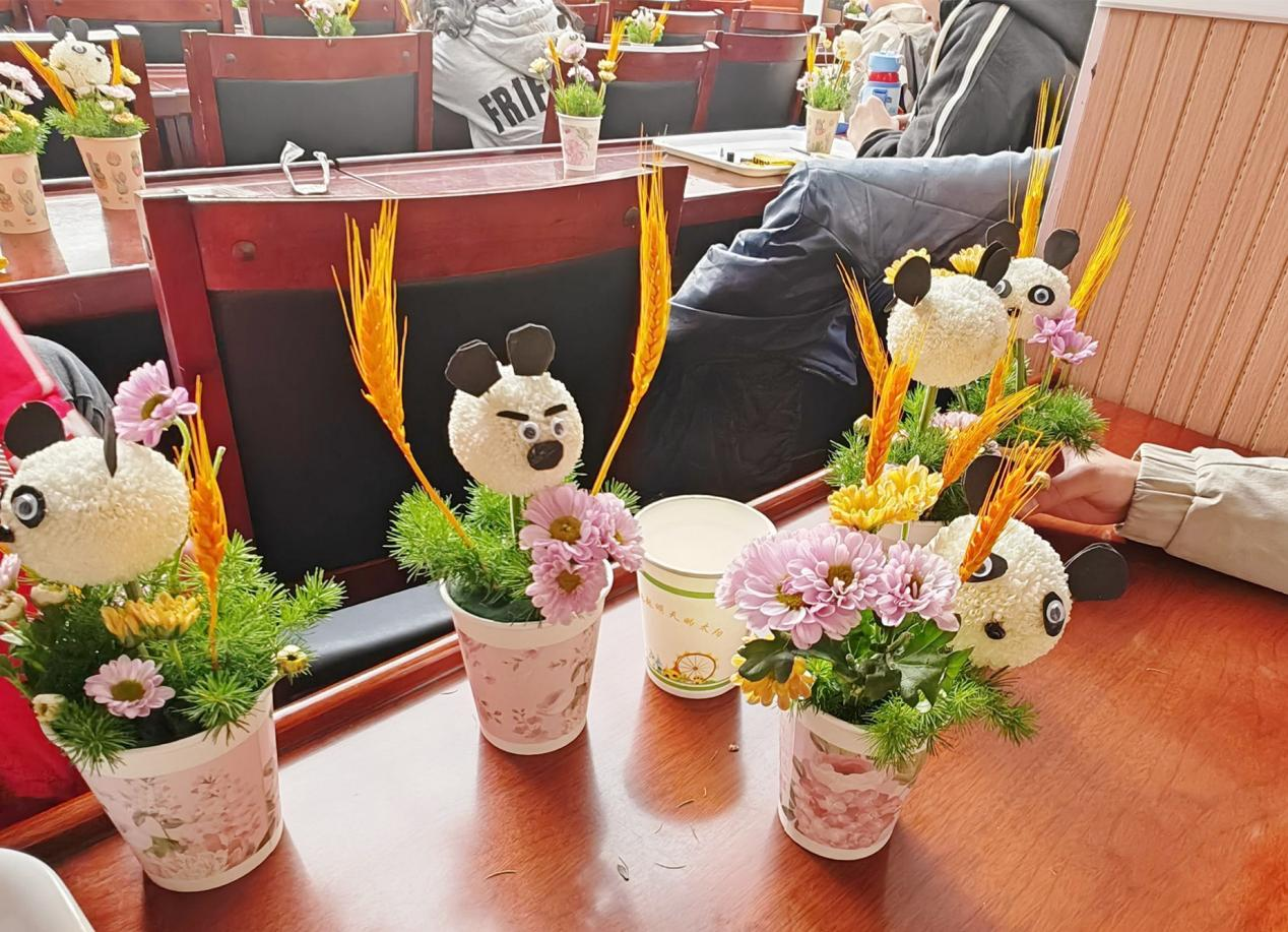 本次花艺课堂的内容是使用以乒乓菊、小雏菊、蓬莱松、麦穗等花材制作小熊猫。孩子们认真聆听老师的讲解,并予以积极的回应。