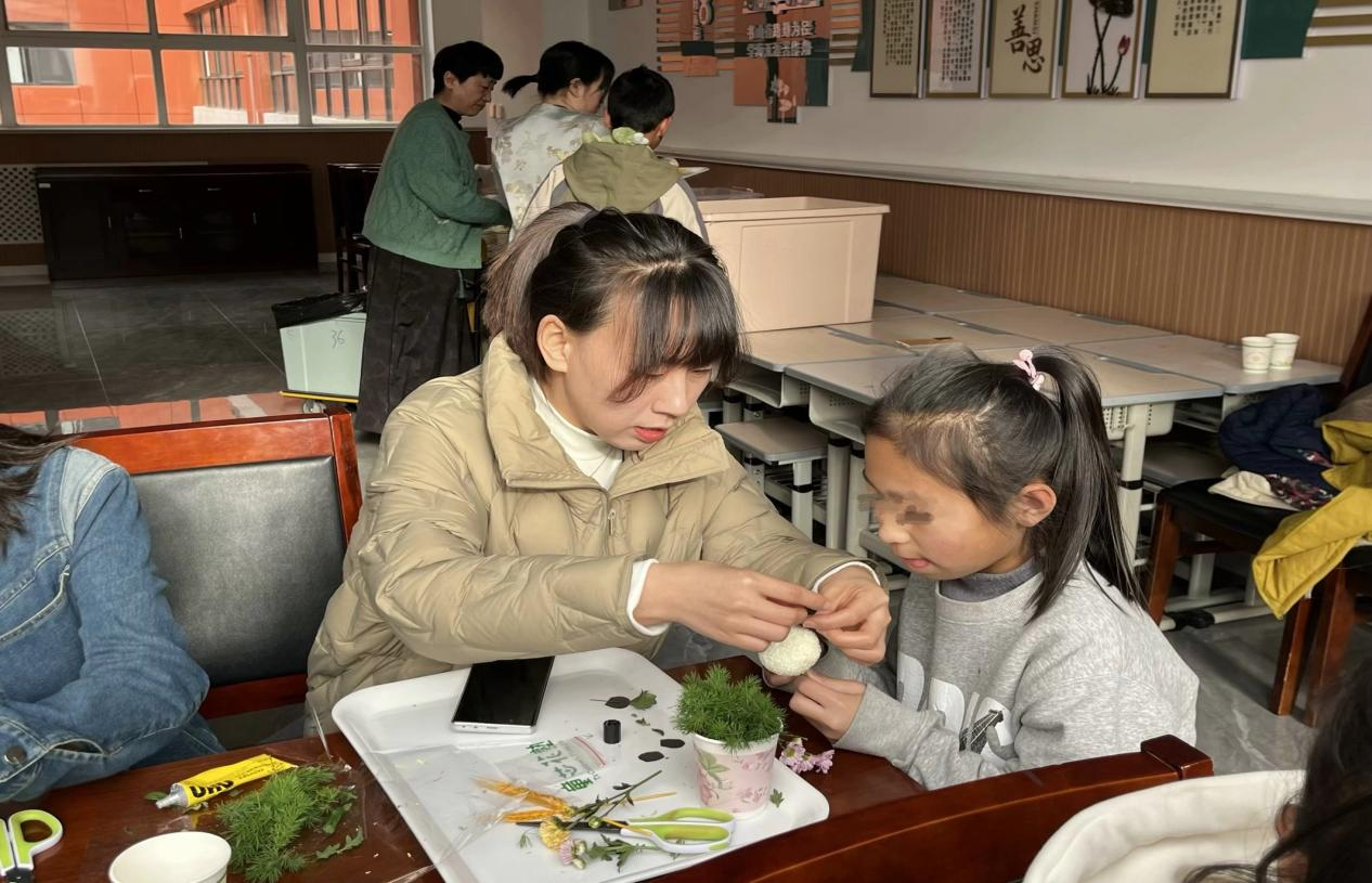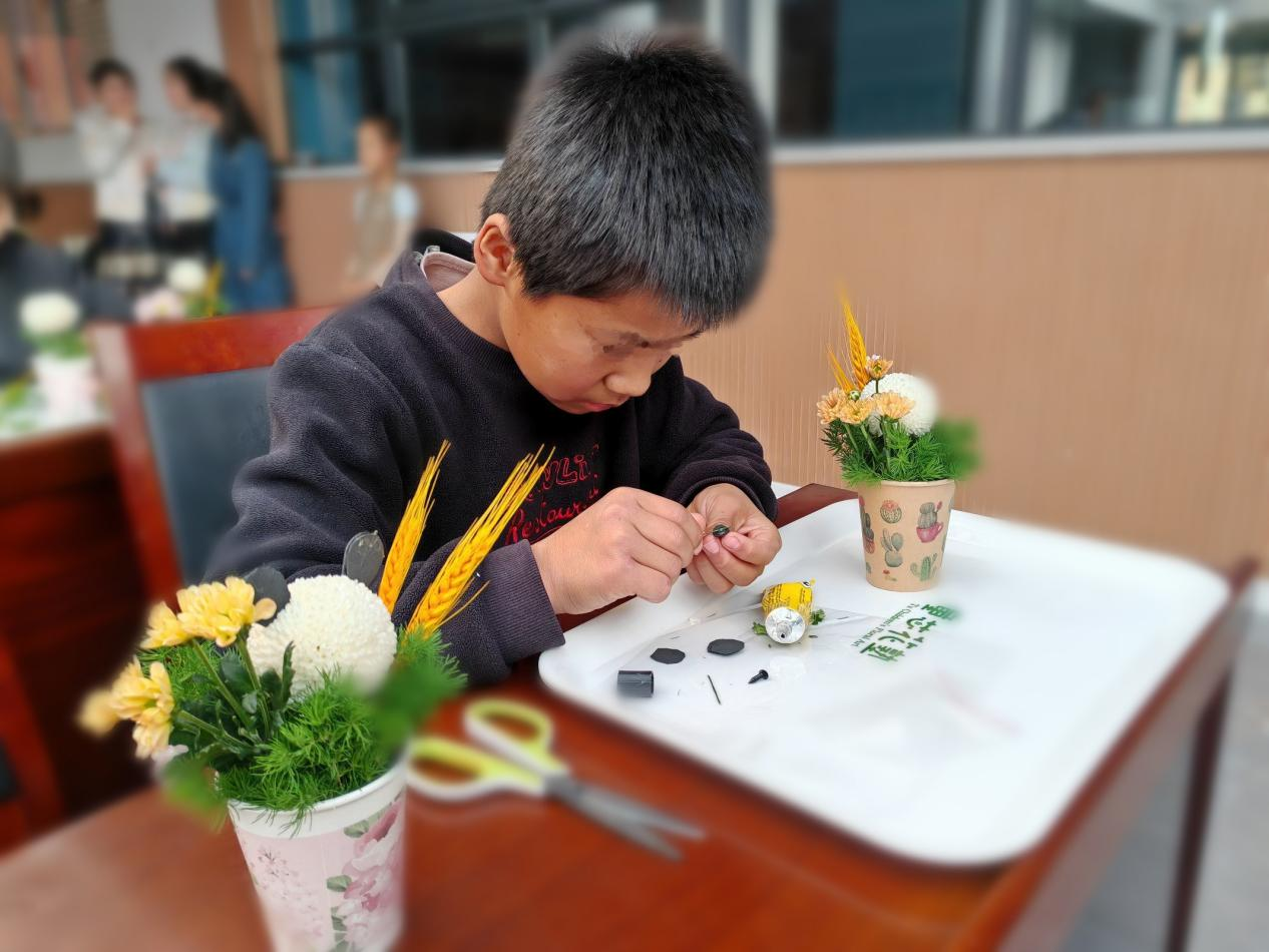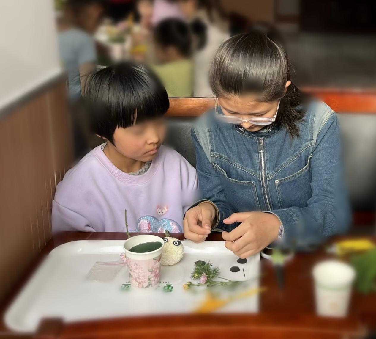 本次花艺课堂的内容是使用以乒乓菊、小雏菊、蓬莱松、麦穗等花材制作小熊猫。孩子们认真聆听老师的讲解,并予以积极的回应。