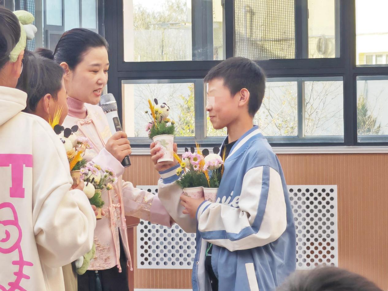 经过巧手插花,一只只憨态可掬的小熊猫呈现出来,有的长着萌萌哒眉毛,有的耳朵上戴着漂亮的花朵,孩子们在每一件作品上都注入了巧思创意。部分动作迅速的儿童,在制作完成一个作品后,再次领取材料包进行了制作,并将自己的作品送给了平日辛苦教导自己的老师们。