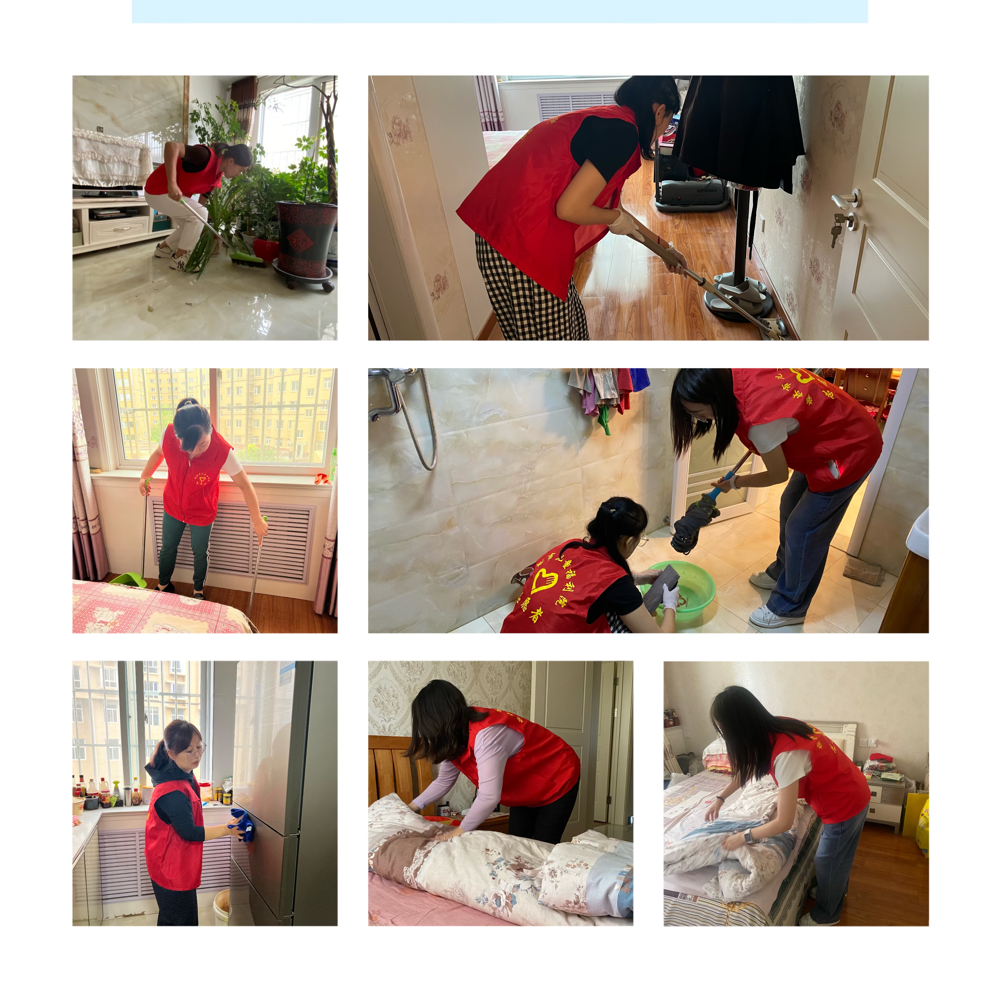 随后,我院党员志愿者积极主动地为老人打扫卫生,有的拖地、有的擦洗厨房死角、有的为老人整理被褥。一会儿工夫,经过大家的努力,从客厅到厨房都打扫得干干净净,老人的家里焕然一新,老人的心里也亮堂了起来。