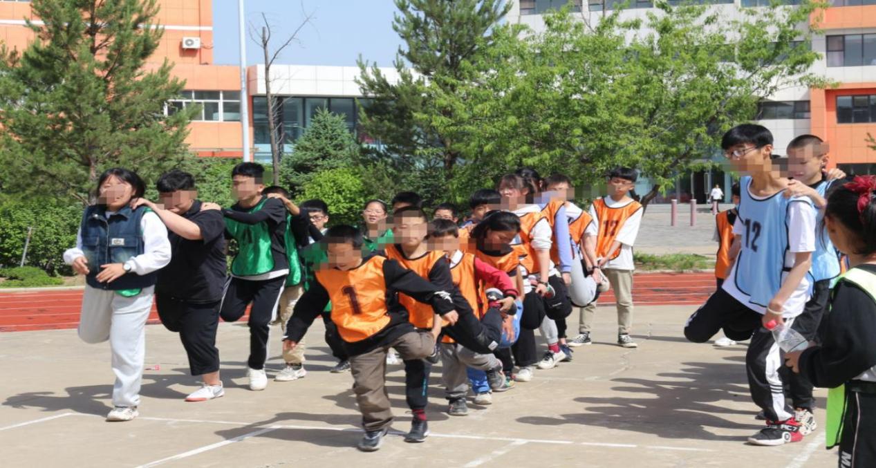 在单腿火车项目中,每组队员齐心协力一个劲儿的往前跳,由于个别队员重心不稳,小火车出现了“断裂”的情况,但是孩子们不气馁、不放弃,哪里跌倒就从哪里站起来,重新与小伙伴配合继续前行。赛场上处处体现着团结互助、顽强拼搏的精神。