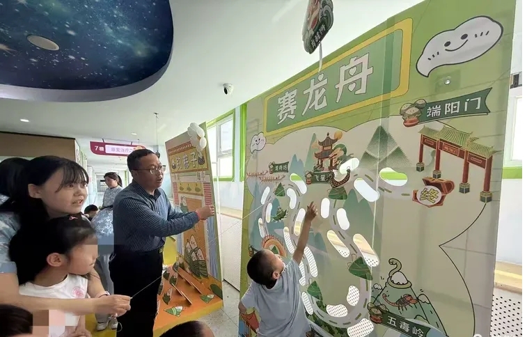 欢乐"钓粽子"游戏区传来阵阵欢笑。孩子们手持特制钓竿,全神贯注地"垂钓"水池中的粽子模型。"我钓到啦!"7岁的小美举着战利品欢呼雀跃。这个融合了端午元素和儿童趣味的游戏,既考验孩子们的手眼协调能力,又让他们在玩乐中了解传统习俗。