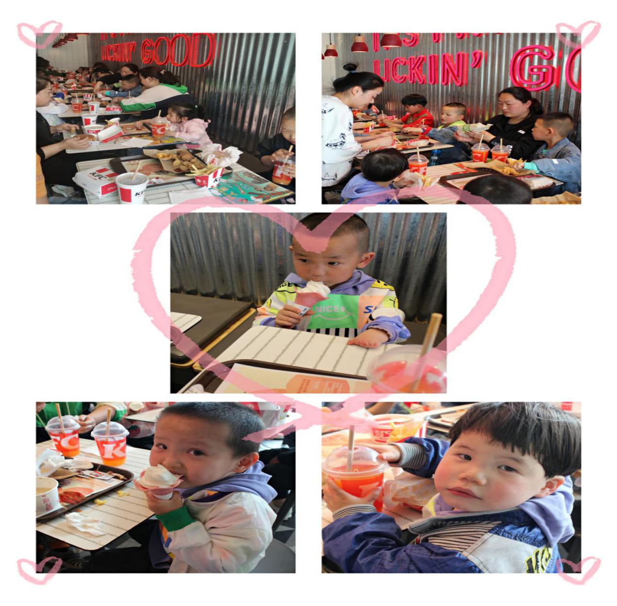 动物园游玩结束,妈妈们又带着孩子们走进了期盼已久的肯德基餐馆,在妈妈们的带领下孩子们有序排队洗手、入座就餐,面对独特的餐馆、美味的食物,孩子们既好奇又惊喜,小眼睛在四周张望,小嘴巴在品尝美味,小脸上洋溢着幸福的笑容,餐后孩子们自己收拾自己的餐盘,把垃圾倒入指定位置,用餐过程中孩子们没有大声喧闹,店里的叔叔阿姨们投来了赞许的目光。