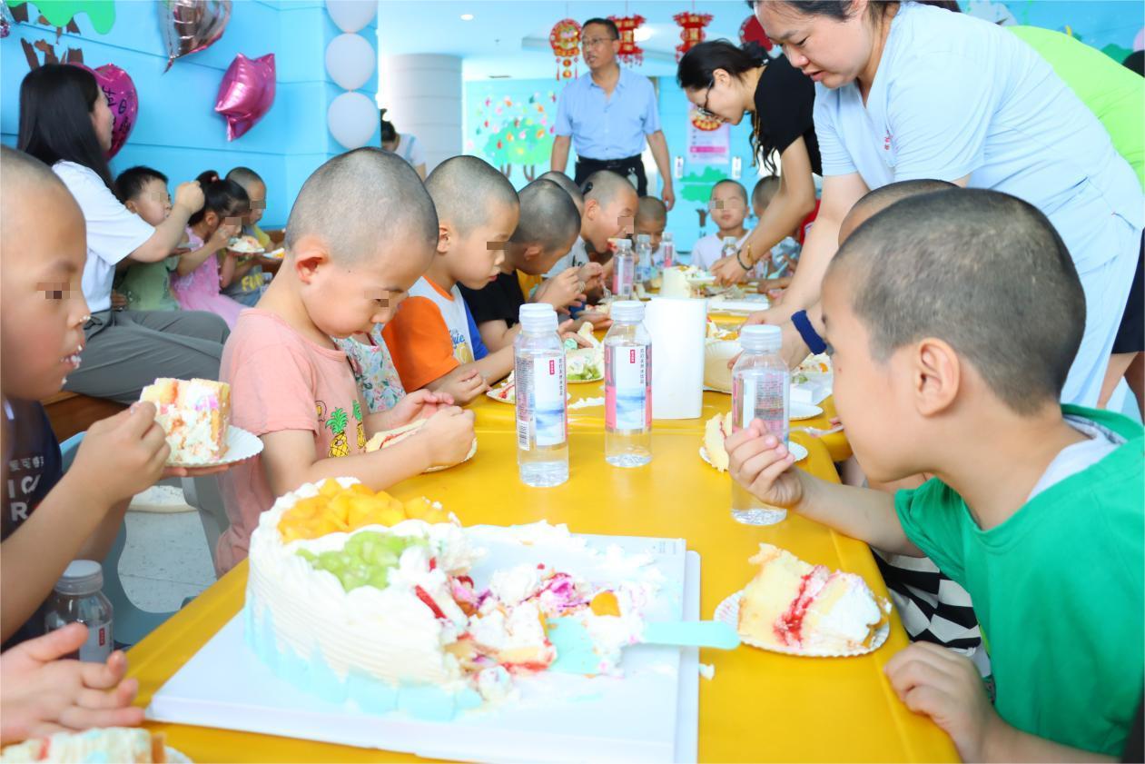 当香甜的生日蛋糕被推上台,雷院长,崔院长和孩子们一起合唱“生日快乐”歌,并亲手为孩子们切分蛋糕,奶油的香甜混着水果的清爽,让孩子们吃得不亦乐乎,你喂我一口,我递你一块,脸上沾满了奶油,却笑得像盛开的花朵般灿烂。