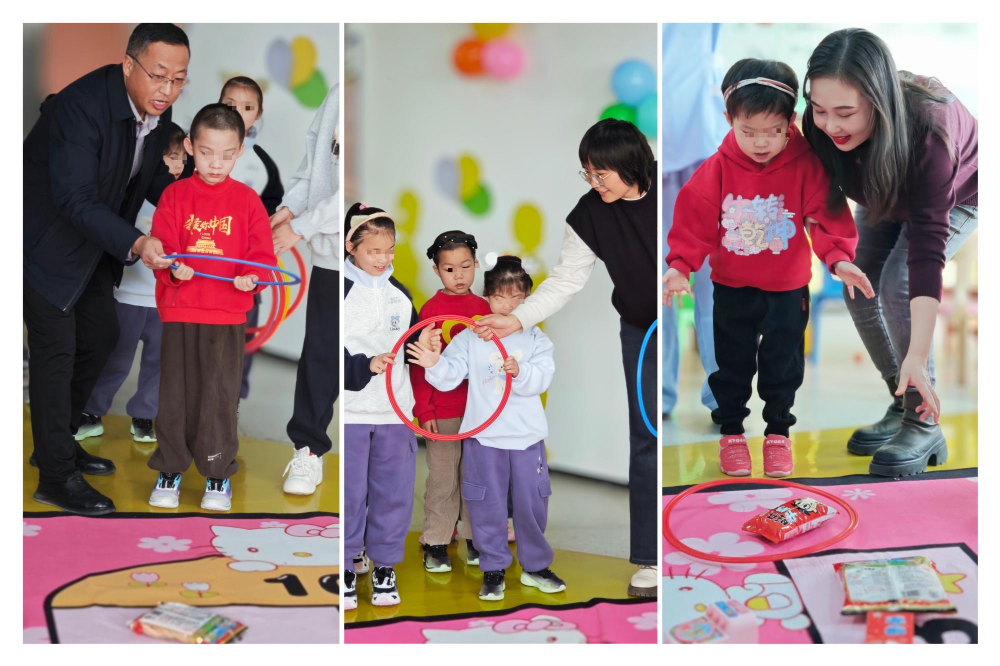 趣味套圈游戏环节备受孩子们喜爱,地面整齐摆放着零食、小玩具等礼品,孩子们在指定距离外套圈,老师根据每个孩子的能力灵活调整套圈距离,还协助肢体障碍儿童完成动作。无论是否套中,每位孩子都能获得新年礼物,在收获惊喜的同时,也体验到了满满的成就感。