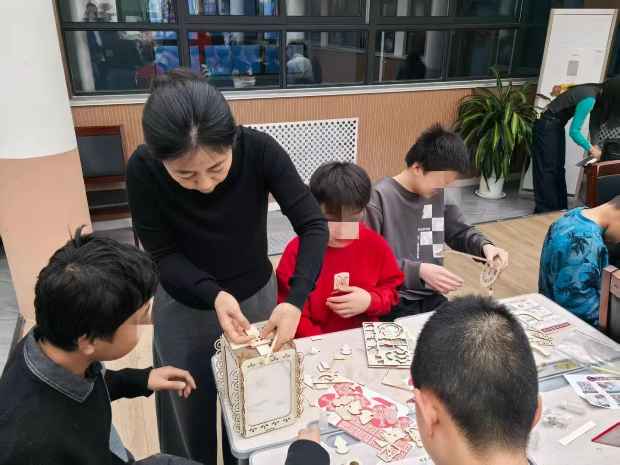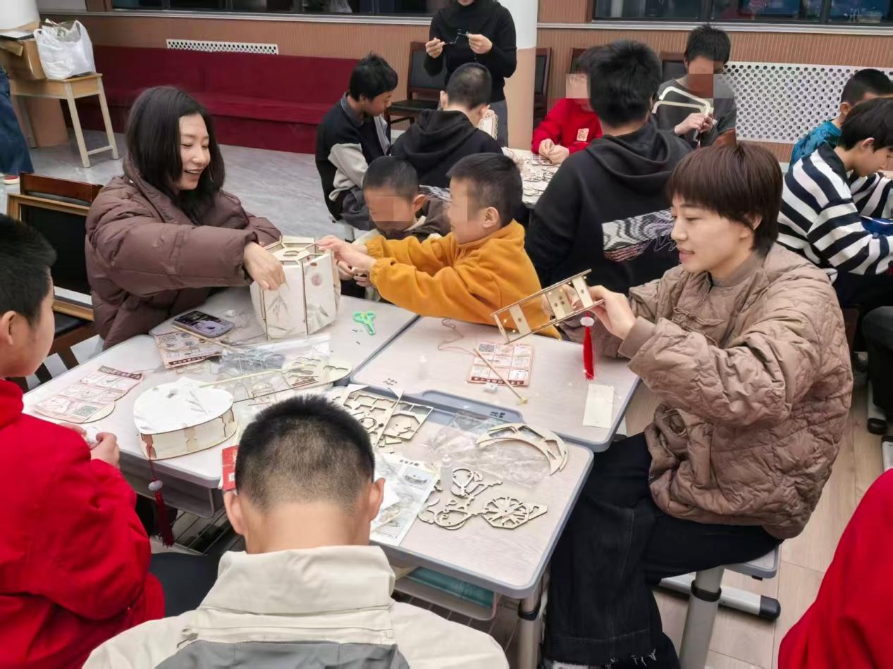 雷院长讲话结束,活动正式开启。孩子们像欢快小鸟,迅速找到小组,在社工和老师帮助下挑选材料包。现场热闹非凡,讨论声、欢笑声交织。社工和老师穿梭其中,耐心指导,提醒安全。孩子们专注创作,有的用珍珠贴画,有的绘制生肖贺卡,有的组装星空灯笼,脸上洋溢幸福笑容。