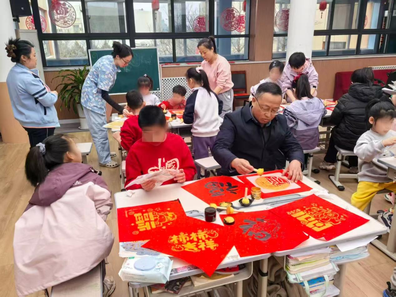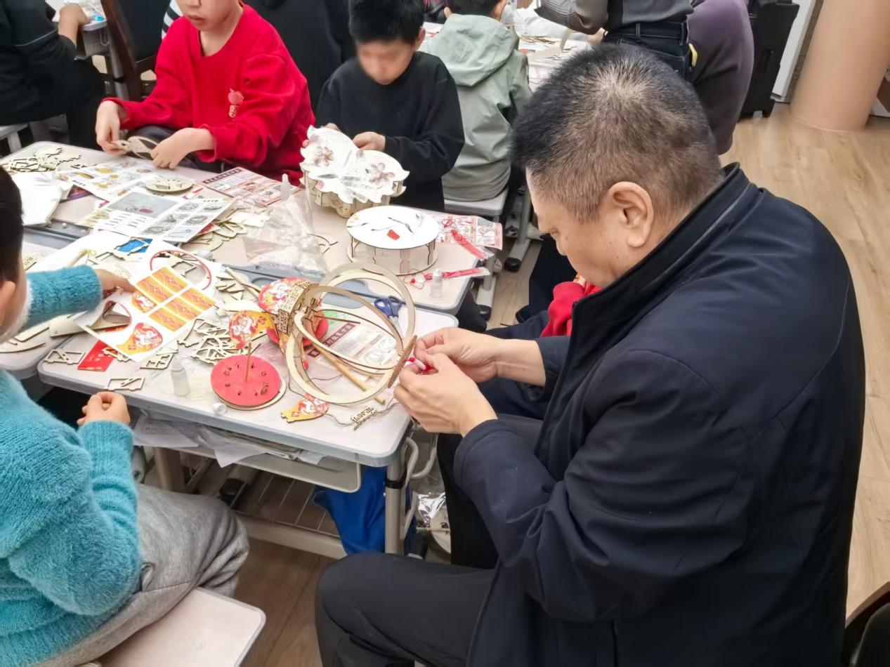 雷院长、崔院长与白主席,“手工创作”阶段深入各小组,与孩子们并肩围坐。院领导们放下繁忙政务,在不影响日常工作的前提下,化身“大队友”,手把手指导孩子贴珍珠、组灯笼。这种跨越年龄的共同创作,让现场充满了家一般的温馨,也让孩子们在专注指尖技艺的同时,深切感受到了长辈的关爱。